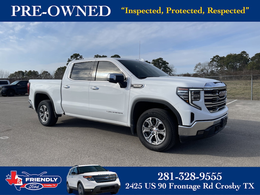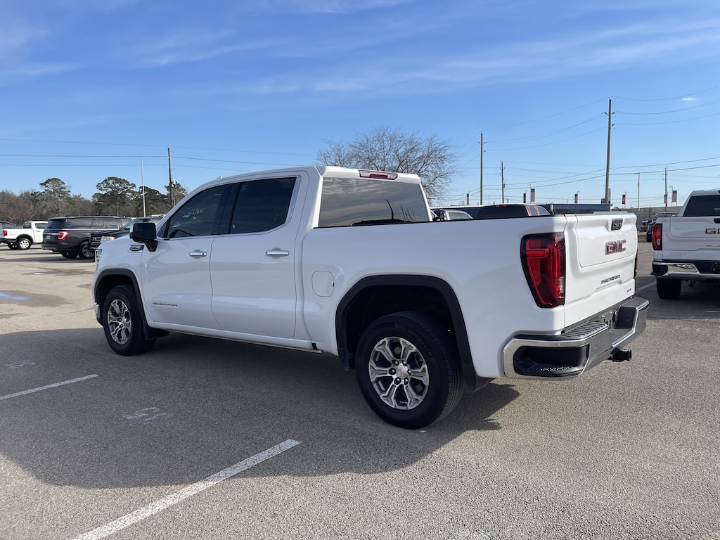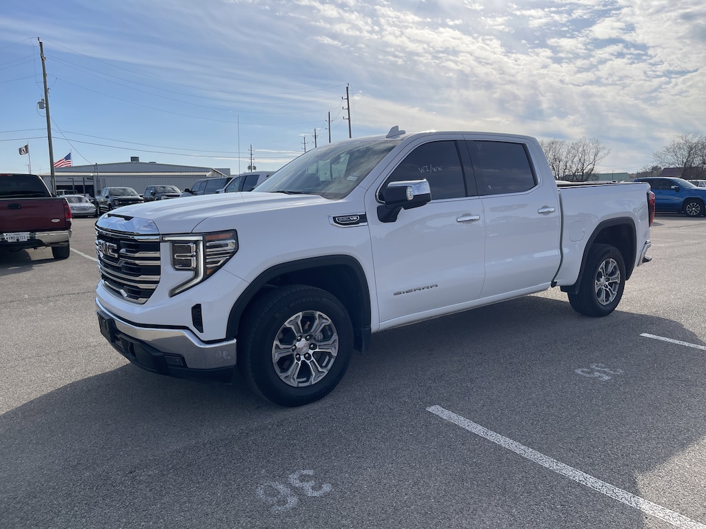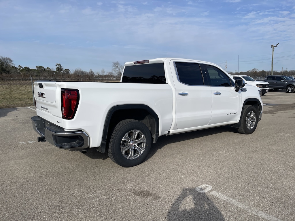 Summit White 2025 GMC Sierra 1500 SLT RWD 10-Speed Automatic EcoTec3 5.3L V8 10-Speed Automatic, Jet Black Leather, 120-Volt Bed Mounted Power Outlet, 120-Volt Interior Power Outlet, 170 Amp Alternator, 2 Charge/Data USB Ports, 2 Type-C Charge-Only Rear USB Ports, 6-Speaker Audio System Feature, Auto-Locking Rear Differential, Auxiliary External Transmission Oil Cooler, Chrome Header & Chrome Grille Insert Bars, Color-Keyed Carpeting Floor Covering, Deep-Tinted Glass, Electric Rear-Window Defogger, Front Frame-Mounted Black Recovery Hooks, Front Rain-Sensing Wipers, HD Rear Vision Camera, Hitch Guidance, Integrated Trailer Brake Controller, Keyless Open & Start, LED Cargo Area Lighting, Manual Tilt-Wheel & Telescoping Steering Column, Navigation System, OnStar Services Capable, Perimeter Lighting, Power Door Locks, Power Front Passenger Windows w/Express Up/Down, Power Front Windows w/Driver Express Up/Down, Power Rear Windows w/Express Down, Preferred Equipment Group 4SA, Push Button Start, Rear Wheelhouse Liners, Remote Vehicle Starter System, SiriusXM w/360L Trial Subscription, Steering Wheel Audio Controls, Theft Deterrent System (Unauthorized Entry), Trailering Package, Wi-Fi Hotspot Capable.